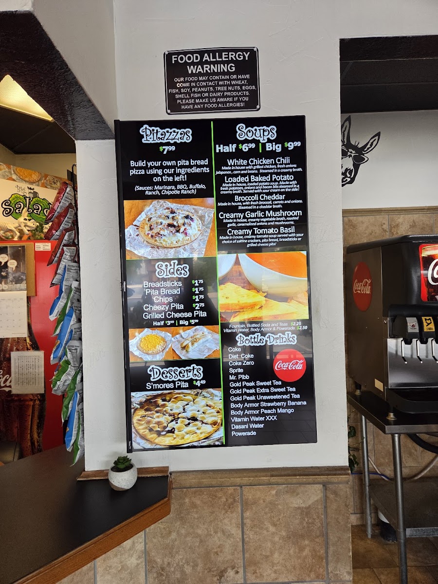 Highlights include signature salads like the Taco Salad and the Spring Berry Salad with chicken, alongside customizable options that let you build your own salad just the way you like it. For something a bit different, pita pizzas and homemade soups provide warmth and variety throughout the day.